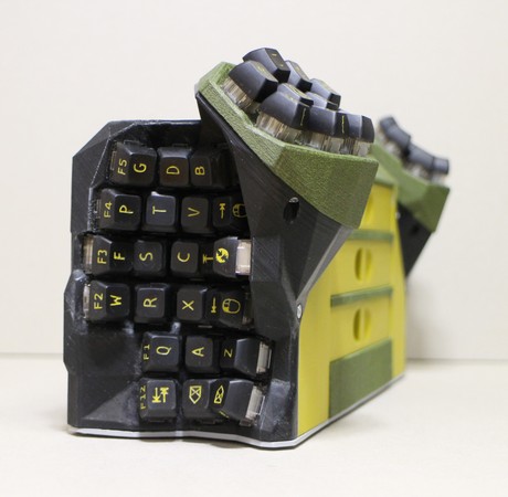 A diploid, concave, columnar keyboard, with vertical finger clusters beneath large horizontal thumb clusters.